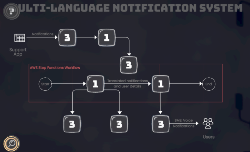 完成第12關後,玩家將深入理解如何整合如 Amazon Translate、Amazon Comprehend、Pinpoint 等服務,實現跨語言、個人化、可擴展的通知解決方案,並掌握如何運用 Step Functions 協調無伺服器工作流程,有效簡化邏輯處理流程與開發負擔。