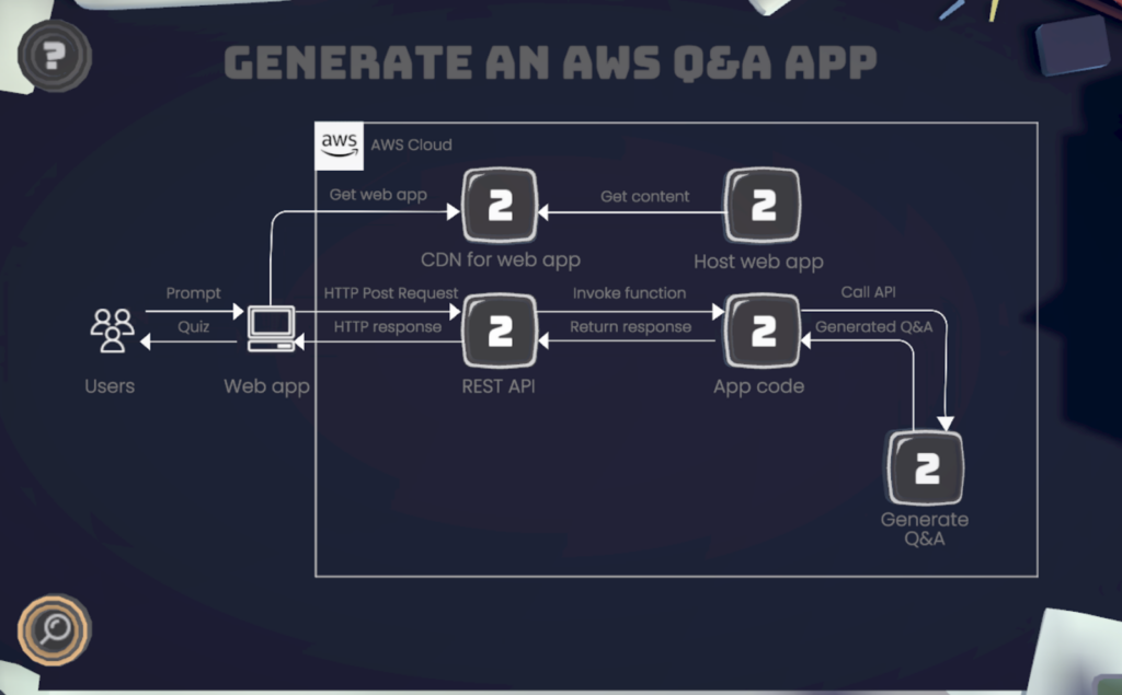 在這一關中,玩家將實作一個互動式問答學習系統,能根據使用者輸入的主題,透過生成式 AI 即時產出練習題目與答案,協助使用者複習 AWS 雲端概念。本關以 AWS 證照備考為應用情境,讓玩家打造一個具備內容生成、前後端串接與網頁託管能力的完整應用。