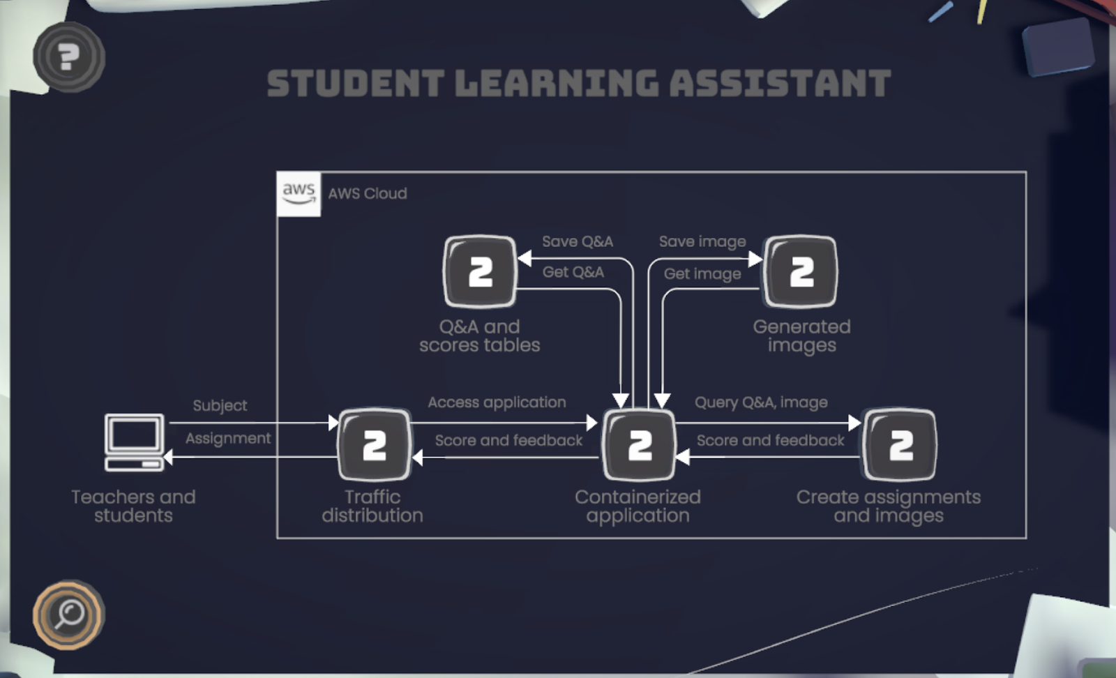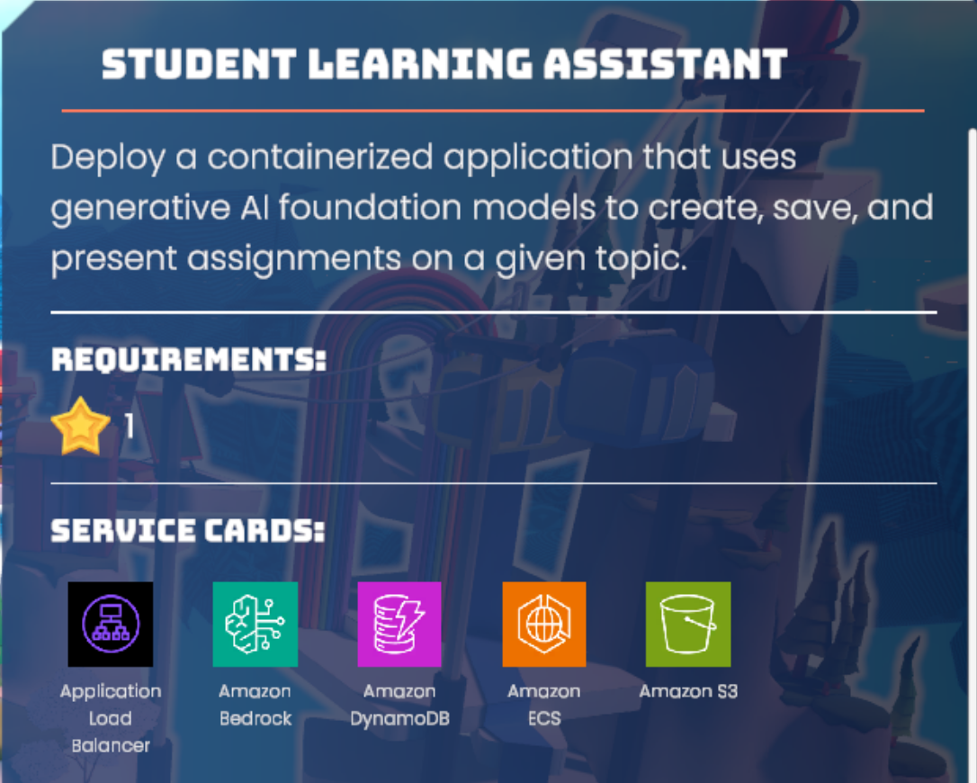 在這一關中,玩家將實作一個學生學習助理系統,能根據指定主題自動產出作業題目與對應圖片,並記錄學生的作答與分數。這個系統會部署在雲端的容器服務中,並整合多項 AWS 服務與生成式 AI 模型。