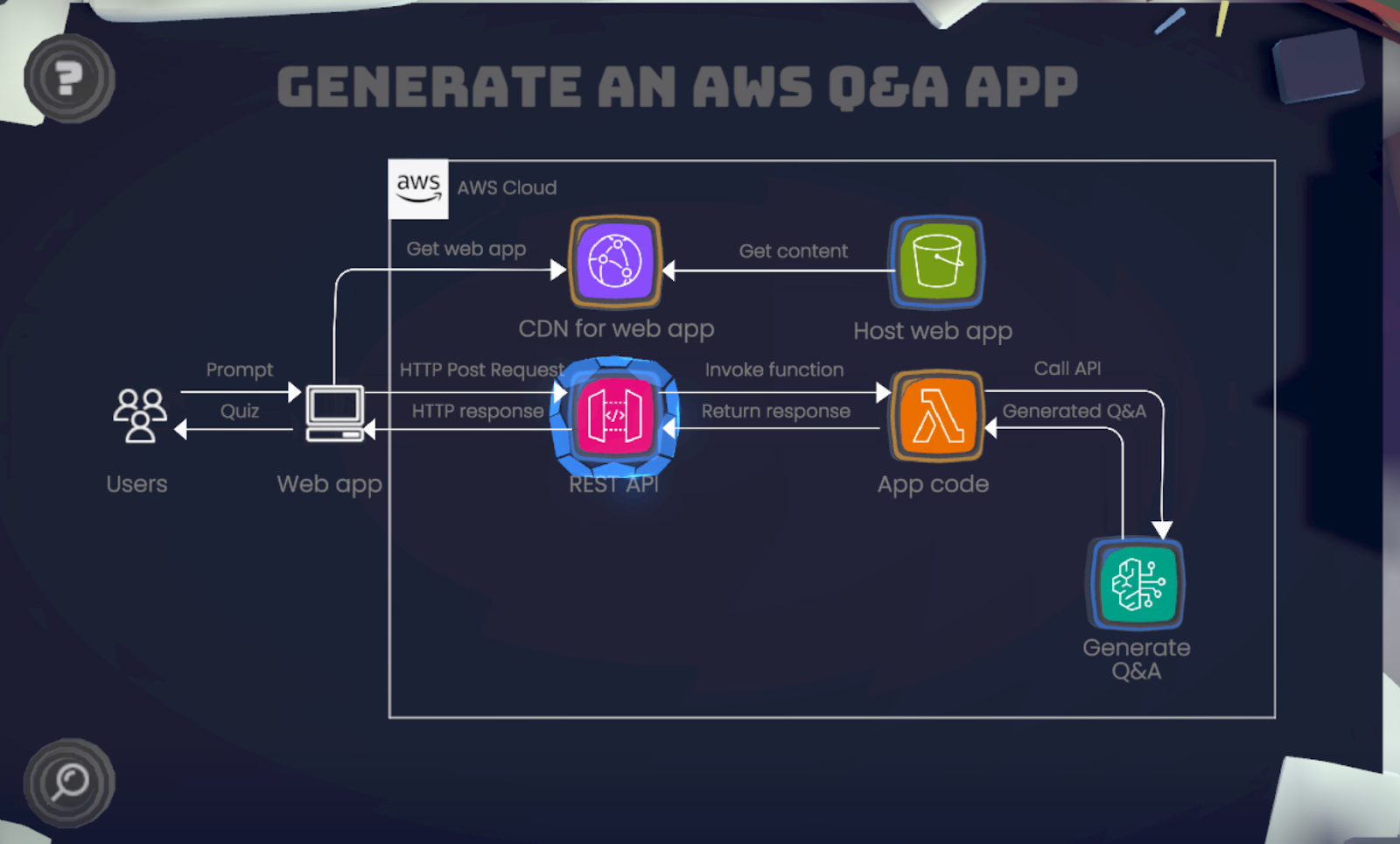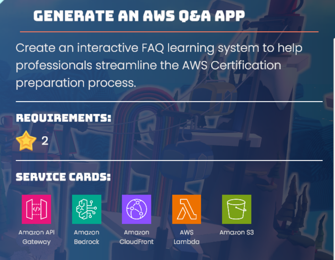 在這一關中,玩家將實作一個互動式問答學習系統,能根據使用者輸入的主題,透過生成式 AI 即時產出練習題目與答案,協助使用者複習 AWS 雲端概念。本關以 AWS 證照備考為應用情境,讓玩家打造一個具備內容生成、前後端串接與網頁託管能力的完整應用。