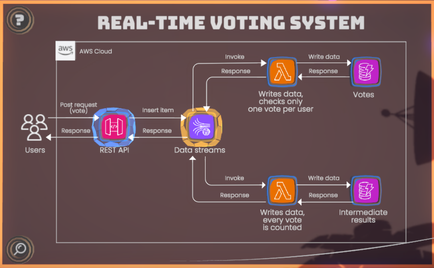 透過遊玩本關,學習基本的無伺服器服務架構,並理解系統如何即時同步平行處理投票資料。