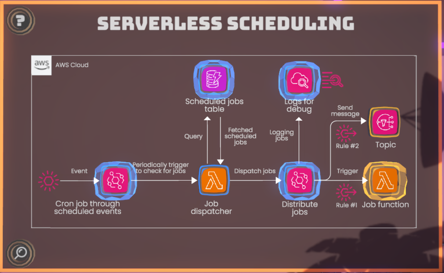 透過遊玩本關,學習更深入的無伺服器服務架構,理解此系統如何分別用定時、Rule進行程式調度,以及如何記錄用來除錯的Log。
