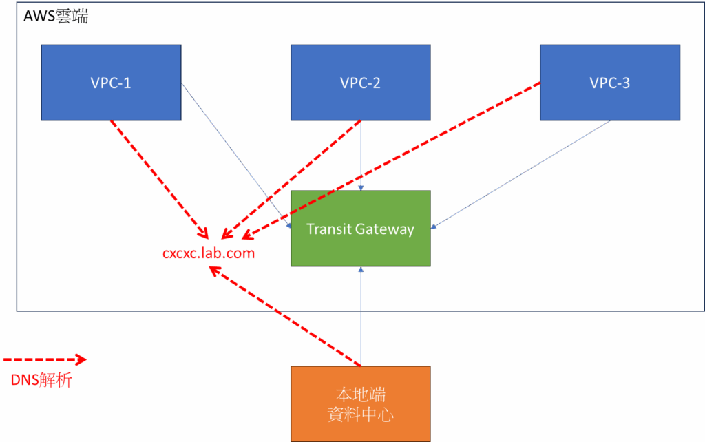 依照情境我們先出一張圖讓大家清楚,可以看到我們在AWS雲端上的多個VPC與本地端的資料中心,都要能夠正常的去解析訪問正確的 cxcxc.lab.com 這個域名。