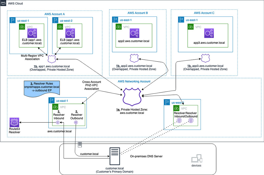這家公司在AWS雲端上部署不同的系統,在好幾個 VPC之中,都透過 Transit Gateway 讓所有網路互通;同時,也串接總公司本地端的資料中心,為了要讓本地端、所有 VPC 都能解析同一個私有網域,他們必須建立一套效能最佳、維運最低的 Hybrid DNS 架構。