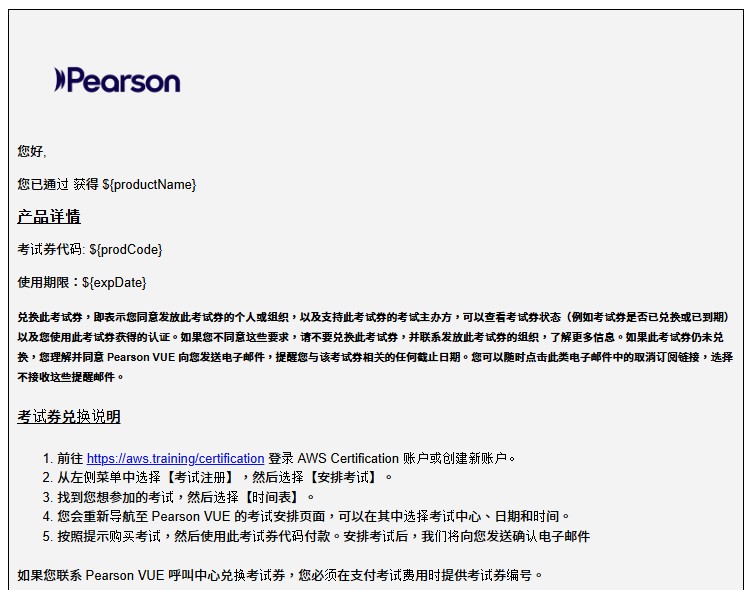 請留意 Pearson Vue 的相關信件,Pearson Vue 是 AWS 官方配合的認證考試券平台